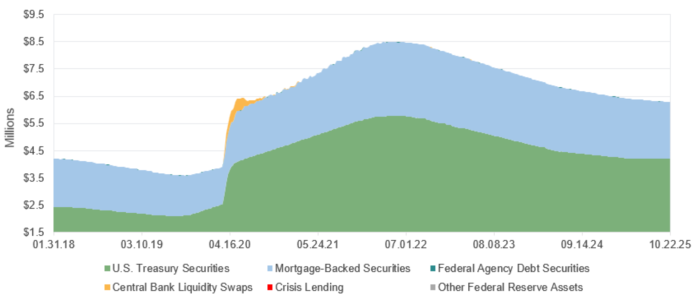 The Fed continued to lower rates again at this week’s meeting following September’s rate cut, lowering the range on the fed funds rate to 3.75%-4.00%. The Fed cited a weaker job market as job gains have slowed, and the unemployment rate has edged up. The Fed acknowledged that downside risks to employment have risen in recent months. The Fed also announced the end of their balance sheet run-off, known as Quantitative Tightening (QT), beginning December 1. The Fed’s balance sheet ballooned to over $8.6 trillion in 2022 coming out of the pandemic, but has since been reduced by more than $2 trillion, bringing the balance below $6.6 trillion, its lowest level since 2020.