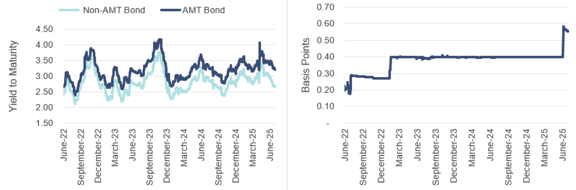 As shown in the charts below, bonds subject to AMT consistently offer additional yield compared to their non-AMT counterparts. The historical yield premium varies due to overall tax policy and market conditions. In recent years, uncertainty around tax reform coupled with elevated issuance has pushed the additional yield demanded from investors ranging between 30 and 70 basis points (bps). Yet, with tax policy uncertainty removed following the passage of OBBBA, demand improved and compressed the yield spread to the current level of approximately 55 bps.