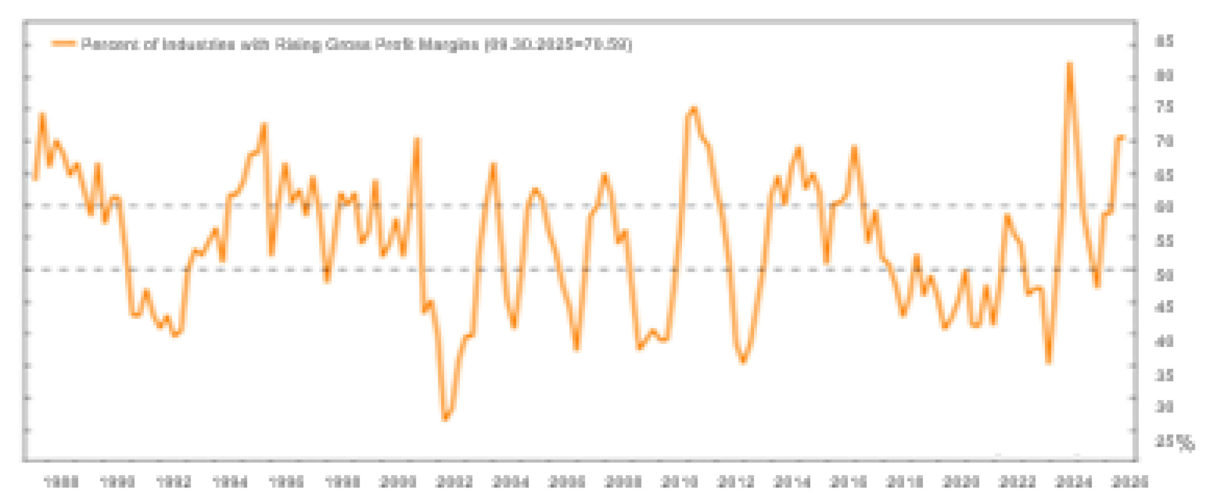 As stock prices tend to follow earnings growth, we think stocks with profits tied to the ebbs and flows of the macro economy or temporary stimulus experience may hit their limit in terms of earnings potential. As their earnings begin to revert back to more historic profitability levels, the stability of earnings that quality stocks provide may offer greater relative value. The chart at the top of this page measures the level of economic surprises over time. As surprises decline from current elevated levels, we believe quality stock performance may improve. The second chart below shows how a broader lift in profit margins has benefitted many industries. Again, looking back, as the percentage of companies with rising margins began to decline, and showed a tendency to favor companies with more consistent earnings, stability, and predictability.