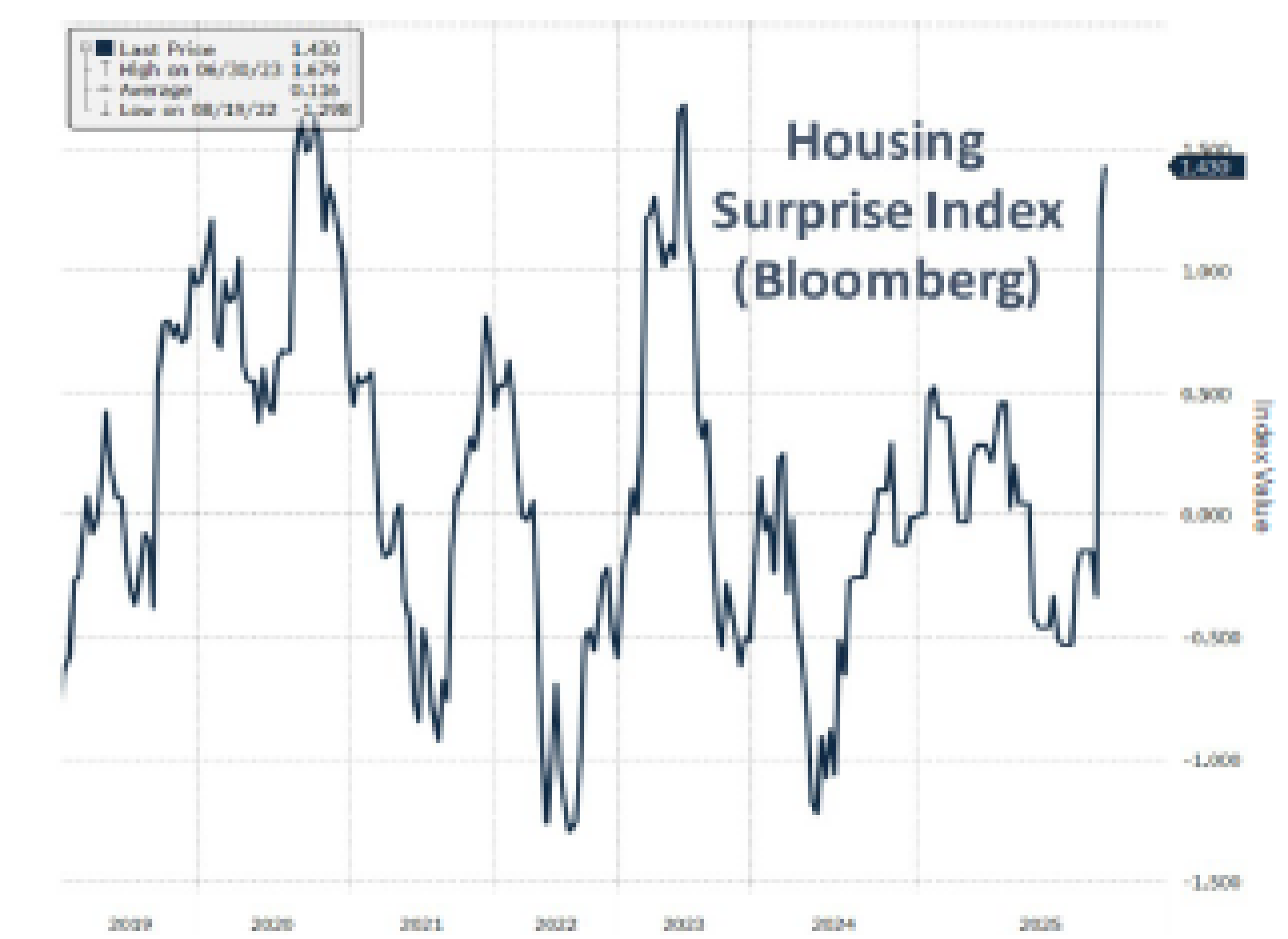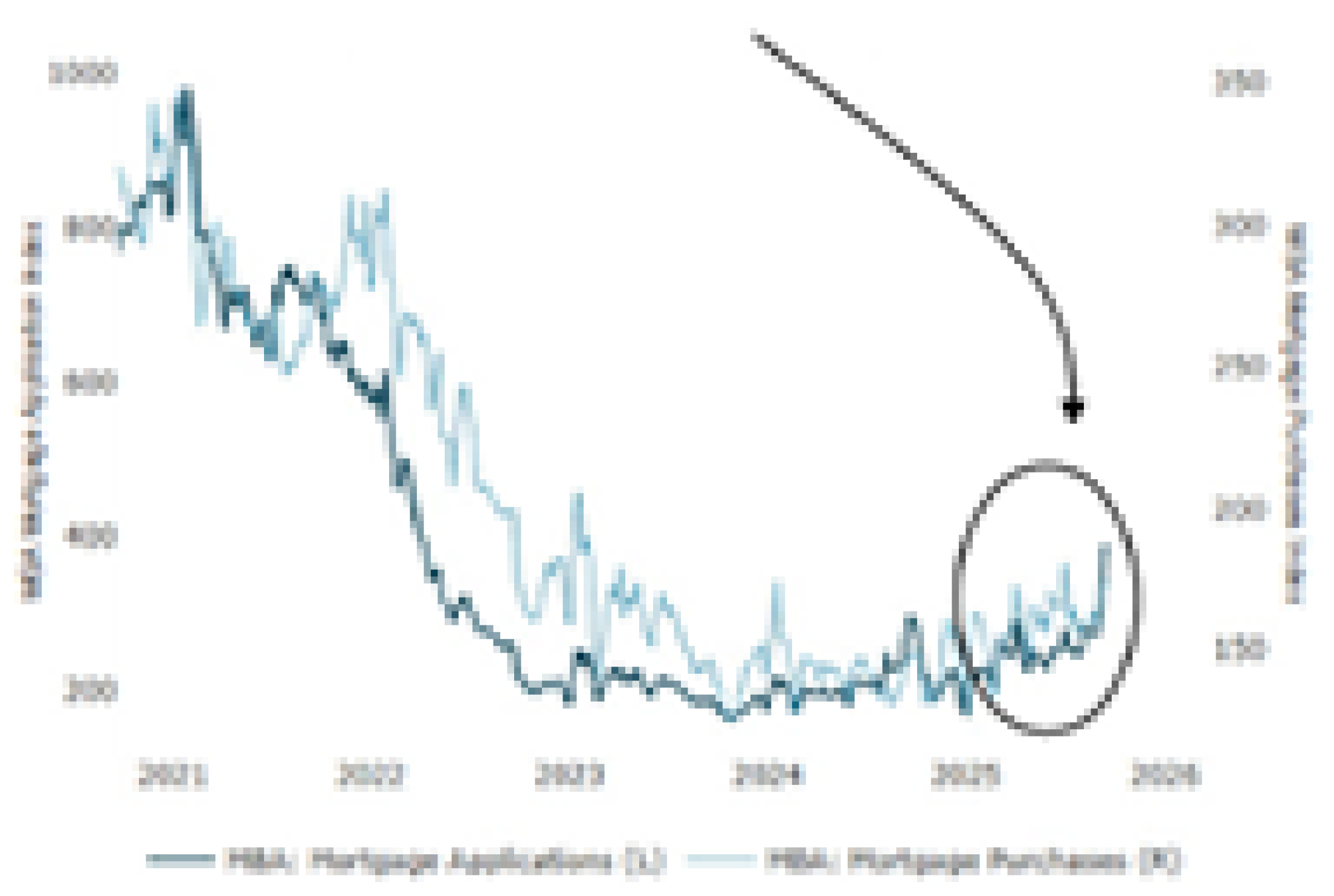 We find it interesting how this “Ice Age” in housing may be thawing, as seen in the charts above. Mortgage rates have started to decline modestly with the resumption in the Federal Reserve Funds’ rate cuts this past month, leading to the uptick in mortgage applications. Although home buying demand may be percolating, builders appear to be cautious as noted by housing starts at close to historic lows.